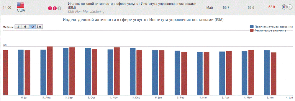 Вместе с тем, Индекс деловой активности в сфере услуг США, рассчитываемый Институтом управления поставками (ISM), заметно ухудшился в мае, достигнув уровня 52,9 по сравнению с 55,7 в предыдущем месяце. Согласно прогнозу, значение показателя должно было снизится до 55,5.