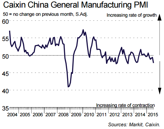 Значение индекса деловой активности /PMI/ производственного сектора экономики КНР упало в июле 2015 года до двухгодового минимума в 47,8 пункта. Июльское снижение стало самым стремительным сокращением индекса с ноября 2011 года.