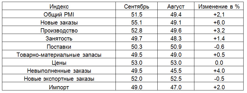Индекс менеджеров по закупкам вырос до 52,3 в сентябре с 51,0 в августе. Это был самый высокий показатель с апреля.