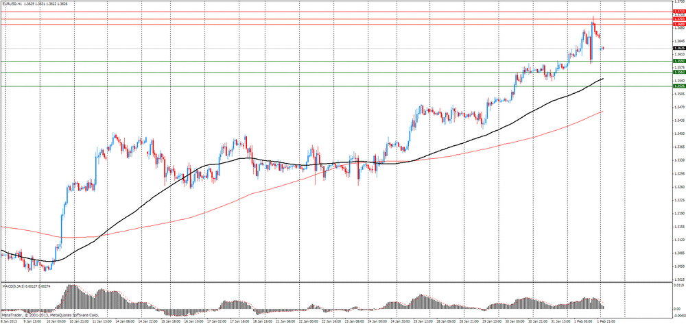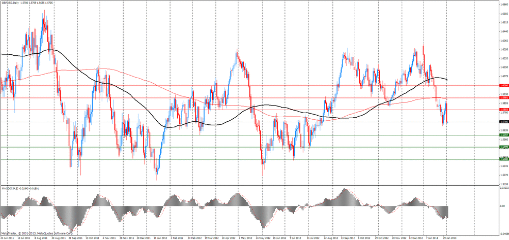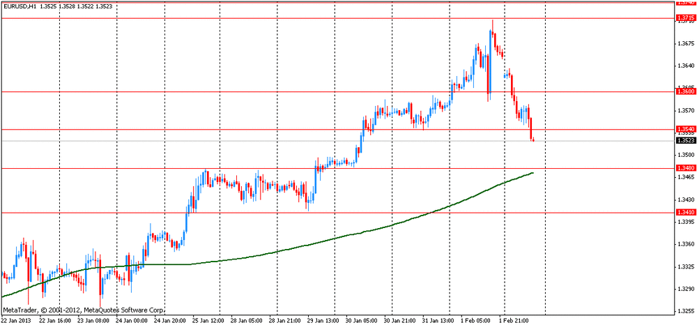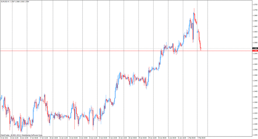 Заметим также, что большой неожиданностью для многих оказался отчет, опубликованный Министерством торговли, который показал, экономическая активность в США неожиданно сократилась в течение последних трех месяцев 2012 года, показав падение ВВП в первый раз в течение трех лет. В докладе показано, что ВВП снизился на 0,1 процента в четвертом квартале после роста на 3,1 процента в третьем квартале. Небольшое падение стало неожиданностью для экономистов, которые ожидали, что ВВП увеличится примерно на 1,0 процент. Кроме того, положительным оказался отчет от Департамента труда, который показал, что число рабочих мест вне сельскохозяйственного сектора в США увеличилось на 157 000 рабочих мест в январе, что меньше пересмотренного вверх увеличения на 196 тысяч рабочих мест в декабре. Кроме того, показатель за ноябрь был пересмотрен со 161 тысяч аж до 247 тысяч. Экономисты ожидали, что занятость увеличится примерно на 165000 рабочих мест по сравнению с добавлением 155000 рабочих мест, о которых первоначально сообщалось в предыдущем месяце.