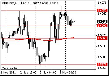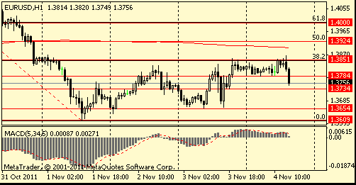 Цены на золото снижаются одновременно с распродажами на фондовых рынках и ростом доллара в связи с неопределенностью ситуации с долговым кризисом в еврозоне. Вышедшая в США макроэкономическая статистика оказала поддержку доллару. Уровень безработицы составил в октябре 9,0%, ожидалось 9,1%, предыдущее значение 9,1%. Занятость в несельскохозяйственном секторе выросла в октябре на 80 тыс, ожидалось повышение на 95 тыс, предыдущее изменение было пересмотрено с +103 тыс до +158 тыс. Средняя почасовая заработная плата выросла в октябре на 0,2%, как и ожидалось, предыдущее изменение было пересмотрено с +0,2% до +0,3%.