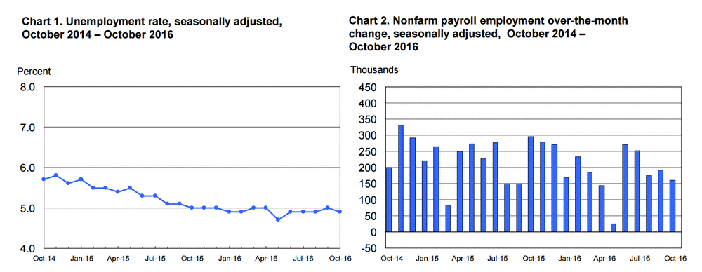 Департамент труда заявил, что с учетом сезонных колебаний занятость в несельскохозяйственных отраслях увеличилась на 161 тыс. в октябре, что последовало за ростом на 191 тыс. в сентябре (изменение было пересмотрено с +156 тыс.). Экономисты ожидали, что занятость вырастет на 175 тыс. В среднем за последние три месяца темпы найма составили 175 тыс. С начала 2016 года средний темп роста занятости составил 181 тыс., что значительно меньше среднего значения 2015 года на уровне 229 тыс. Данные показали, что в октябре число рабочих мест выросло в большинстве секторов экономики, за исключением некоторый отраслей промышленности, включая производство, розничную торговлю и добычу полезных ископаемых.