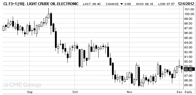 Напомним, что в течение прошлого месяца, фьючерсы на Западную сырую нефть Texas Intermediate видели медленный, но устойчивый рост с $84 до максимумов около $90. Но опасения, что экономика США может существенно пострадать от неудачных переговоров, связанных с «бюджетным обрывом» снижает вероятность дальнейшего роста.