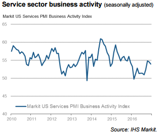 С учетом сезонных колебаний окончательный индекс деловой активности в секторе услуг США от Markit снизился до 53,9 в декабре с 54,6 в ноябре, и сигнализировал о самом медленном росте активности в секторе услуг в течение трех месяцев. Тем не менее, последнее чтение было заметно выше нейтрального уровня 50,0 и указало на твердые темпы роста. Более того, среднее значение в течение последнего квартала 2016 года (54,4) было самым сильным с 4 квартала 2015 года.