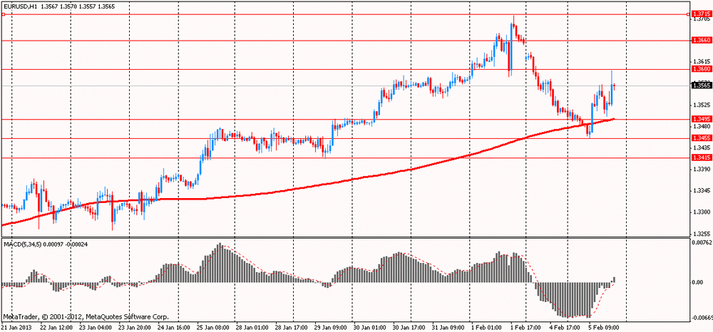 Сейчас пара торгуется с повышением на 0,45% в области $1.3560. Следующее сопротивление расположено на $1.3660 (максимум 4 февраля) и $1.3715 (максимум 1 февраля), поддержка - на $1.3495 (МА(200) для Н1), $1.3455 (минимум европейской сессии) и $1.3415 (минимум 29 января).