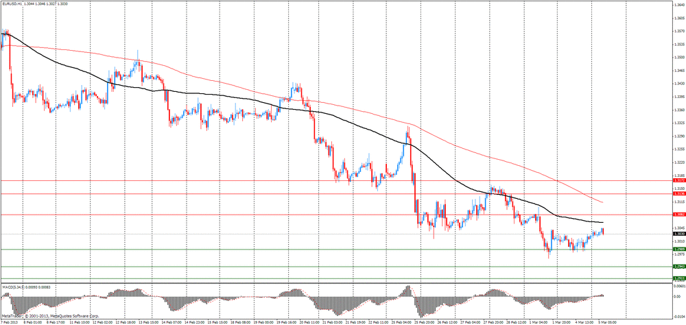 Премьер-министр Японии Синдзо Абэ ожидает от Центробанка под руководством Харухико Куроды смелых действий по борьбе с дефляцией и реанимации экономики, вновь пребывающей в рецессии. Соответствующее заявление глава правительства сделал в парламенте, сообщает Reuters. Наиболее актуальной на сегодняшний день задачей премьер-министр считает скорейшее достижение двухпроцентного уровня инфляции - в соответствии с новыми ориентирами Банка Японии.Вчера курс евро колеблется по отношению к доллару на фоне несостоятельности итальянских политиков создать коалицию. Давление на валюту оказывают предстоящие данные по ВВП Италии за четвертый квартал, которые покажут, что экономика региона сократилась в четвертом квартале 2012 года.