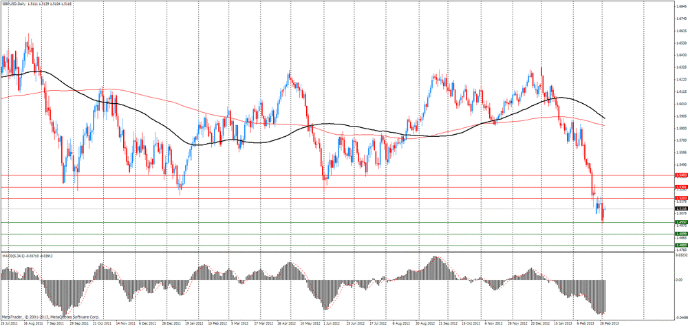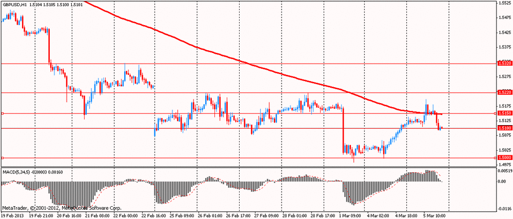 В настоящий момент пара торгуется с понижением на 0,08% на $1.5101. Поддержка находится на $1.5000 (минимум 4 марта), $1.4985 (минимум 1 марта 2013) и $1.4949 (минимум 12 июля 2010). Если цена преодолеет $1.5200, ближайшее сопротивление будет располагаться на $1.5220 (максимум 28 февраля) и $1.5320 (максимум 28 февраля).