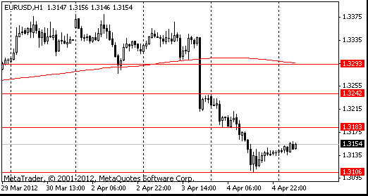 Фондовые индексы США отступили на фоне неблагоприятной макроэкономической статистики. Согласно вышедшим данным, индекс экономических условий ISM в непроизводственной сфере в марте снизился с 57,3 пункта до 56 пунктов при средних прогнозах на уровне 57 пунктов, а индекс деловой активности в непроизводственной сфере ISM упал с 62,6 пункта до 58,9 пункта, тогда как ожидалось сокращение лишь до 62 пунктов. Индикатор занятости ADP в марте несколько превысил прогнозы, хотя и снизился по сравнению с февралем. Также на рынке все еще свежи воспоминания об опубликованных вчера минутках ФРС, из которых стало ясно, что вероятность реализации QE3 в среднесрочной перспективе минимальна. Это, опять же, лишает игроков желания совершать покупки на рынке акций. Распродажа перешла и на сырьевой рынок, где особенно удручающе смотрелись драгоценные металлы.
