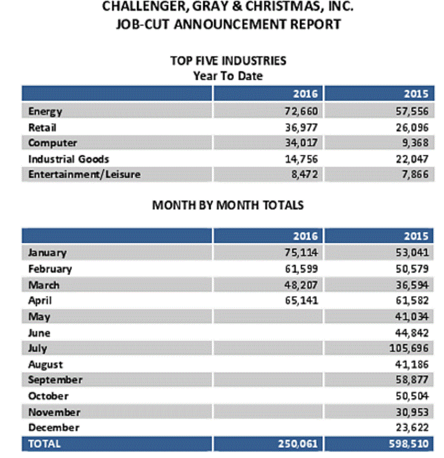 "Мы продолжаем видеть масштабные увольнения в энергетическом секторе, где низкие цены на нефть негативно влияют на прибыль. Тем не менее, мы также отмечаем непростую ситуацию в других областях, таких как компьютерный сегмент и розничная торговля, где меняющиеся тенденции потребления создают много волатильности", - сказал Джон А. Челленджер, главный исполнительный директор Challenger Gray & Christmas Inc.
