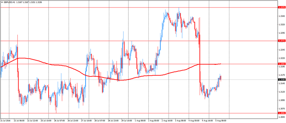 Во вторник фунт вырос более чем на 150 пунктов, обновив максимум 18 июля, что было вызвано ослаблением американской валюты и публикацией лучших, чем ожидалось данных по Британии. Как стало известно, индекс деловой активности в строительном секторе от Markit упал до 45,9 в июле с 46,0 в июне. Согласно прогнозам, индекс должен был снизиться до 43,8. Значение индекса было ниже нейтрального уровня 50,0 второй месяц подряд. Показатель сигнализировал о самом быстром спаде производства в строительном секторе с июня 2009 года. Компании заявили, что более слабые портфели заказов продолжали действовать как тормоз деловой активности. Неопределенность после референдума стала основным фактором, который повлиял на деловую активность в июле, особенно в секторе коммерческого строительства,