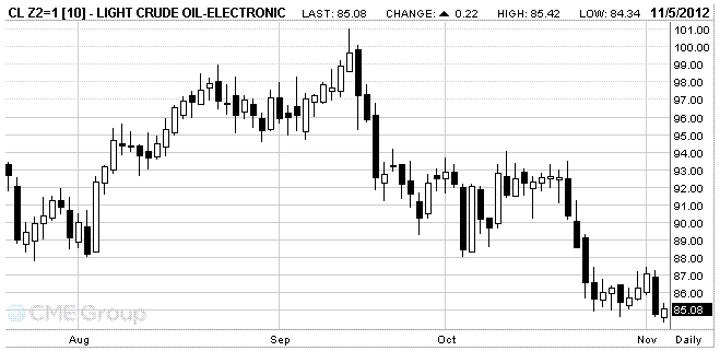 Евро упал до самой низкой отметки почти за восемь недель против доллара на фоне опасений, что Греция может покинуть зону евро, если парламент не утвердит новый раунд мер жесткой экономии на голосовании 7 ноября. Парламент Греции должен за пакет мер по сокращению расходов, повышению налогов и других реформ на сумму 13 миллиардов евро. Если меры и бюджет на 2013 год будут одобрены, то Греция сможет получить помощь от Европейского союза и Международного валютного фонда.
