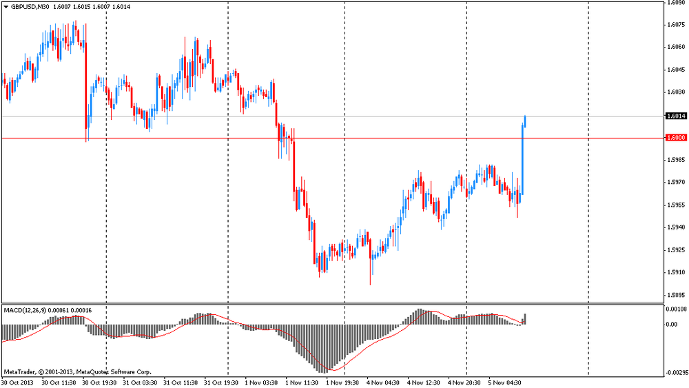 Курс фунта резко вырос против доллара, что было связано с выходом сильных данных по активности в секторе услуг Британии. Активность в британском секторе услуг расширилась самыми быстрыми темпами более чем за шестнадцать лет, показал в октябре опрос, проведенный организацией Markit Economics и Chartered Institute of Purchasing & Supply (CIPS). С учетом сезонных колебаний индекс деловой активности вырос до 62,5 в октябре с 60,3 в сентябре. Октябрьское значение представляет самый сильный рост активности с мая 1997 года. Обследование показало, что объем новых заказов показал самые сильные темпы роста с момента начала ведения опроса в июле 1996 года. Также в течение месяца заметно выросла занятость. В докладе также отмечается, что инфляция ускорилась на фоне роста заработной платы.