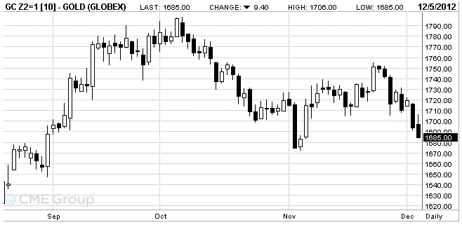 Стоимость декабрьского фьючерса на золото на COMEX сейчас составляет 1685 доллара за унцию.