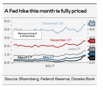 "В ходе своего выступления в пятницу председатель ФРС Йеллен подтвердила, что ФРС может повысить процентную ставку уже на предстоящей встрече (14-15 марта), если статистика по рынка труда, ожидаемая в пятницу, не окажется крайне слабой. Вероятно, мы должны увидеть рост числа рабочих мест ниже 100.000, более высокий уровень безработицы и нулевой прирост заработной платы, чтобы члены FOMC изменили свое мнение. Однако, мы ожидаем, что февральский отчет по занятости окажется достаточно хорошим, и ФРС все-таки повысит ставку в марте (ранее мы прогнозировали повышение в июне). Сейчас рынок учитывает в цене 85% шанс на повышение ставки ФРС на предстоящей встрече. Мы повышаем наш прогноз и теперь считаем, что ФРС увеличит ставку три раза в этом году, а именно в марте, июле и декабре (ранее мы ожидали два повышения, с риском, направленным в сторону третьего повышения ставки), так как ФРС, кажется, меньше беспокоится по поводу инфляции и более позитивно оценивает ситуацию на рынке труда и в экономике в целом. Мы придерживаемся нашей точки зрения о том, что ФРС повысит ставку лишь один раз в 1-й половине 2017, но теперь ждем два повышения ставки во 2-й половине года, поскольку мы получим больше информации о Трампономике. Тем временем, рынки закладывают в цене 2,5 повышения ставки в этом году", - заявили эксперты.