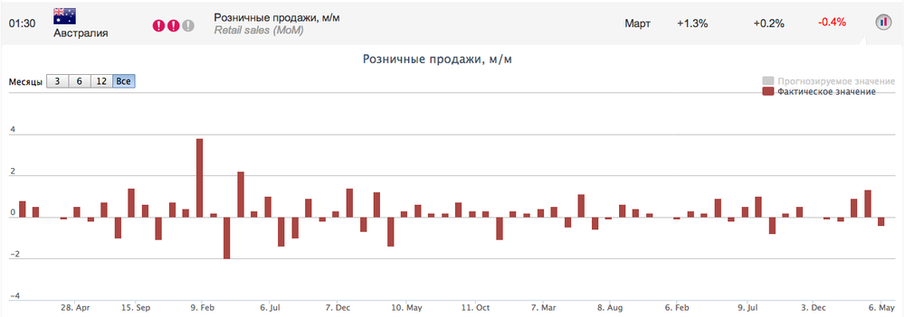 01:30 Австралия Розничные продажи, м/м Март +1.3% +0.2%