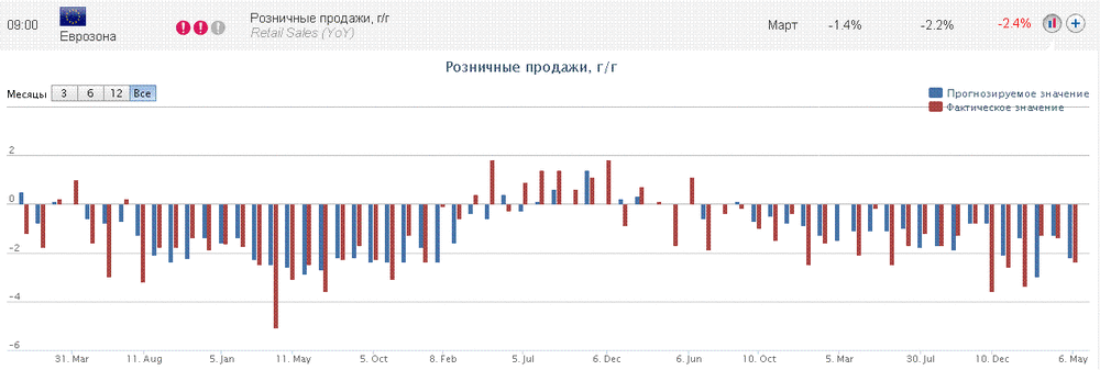 09:00 Еврозона Розничные продажи, г/г Март -1.4% -2.2%