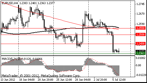 Курс EUR/USD обновил сессионный минимум и продолжает снижаться, после выхода слабых данных по изменению числа занятых в несельскохозяйственных отраслях экономики. Сейчас пара торгуется на уровне 1,2344. Сильным уровнем поддержки сейчас выступает значение 1,2290, на котором находится минимум 1 июня.