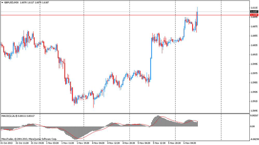 Фунт вырос выше уровня $1.6100, обновив сессионный максимум после выхода позитивных данных по объему промышленного производства в Великобритании. Сентябрьский показатель вырос на 0.9%, тогда как аналитики ожидали подъема только на 0.7%. Таким образом данные превысили оценки экспертов, указав на рост экономики в секторе промышленности.