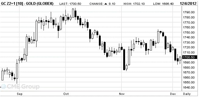 Стоимость декабрьского фьючерса на золото на COMEX сейчас составляет 1700.50 доллара за унцию.