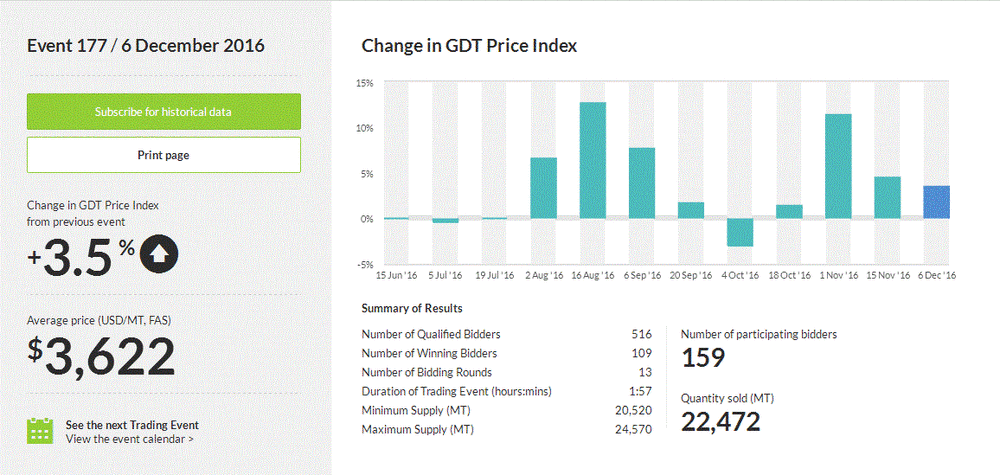 Как стало известно, стоимость молочной продукции выросла на 3,5% (до $3622 за метрическую тонну) после того, как увеличилась на 4,5% в ходе предыдущего аукциона (до $3519 за метрическую тонну). Стоит подчеркнуть, повышение цен фиксируется уже четвертую неделю подряд. Результаты аукциона также показали, что стоимость цельного сухого молока выросла на 4,9%, до $3593 за метрическую тонну.