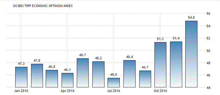 Данные показали, что индекс экономического оптимизма в США, рассчитываемый газетой Investor's Business Daily и исследовательской фирмой TechnoMetrica Institute of Policy and Politics, вырос в декабре на 3,4 пункта, или на 6,6%, достигнув отметки 54,8 пункта. Последнее значение оказалось самым высоким за 10 лет. Эксперты ожидали, что показатель улучшится лишь до 52,3 пункта с 51,4 пункта в ноябре. Напомним, значение индекса выше 50 указывают на оптимизм, а ниже 50 - на пессимизм. Сейчас индекс находится на 6,2 пункта выше 12-месячного среднего значения (48,6) и на 10,4 пункта выше показателя декабря 2007 года, когда экономика вступила в рецессию. Среднее значение индекса за всю историю наблюдений составляет 49,1 пункта.