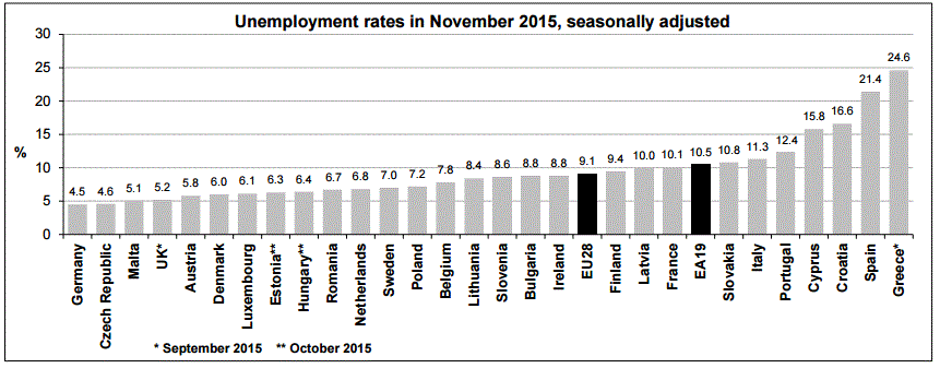 Между тем, данные от Евростат показали, что по итогам ноября уровень безработицы в еврозоне уменьшился до 10,5% с 10,6% в октябре (пересмотрено с 10,7%). Последнее значение оказалось наименьшим с октября 2011 года. Эксперты ожидали, что уровень безработицы составит 10,7%.