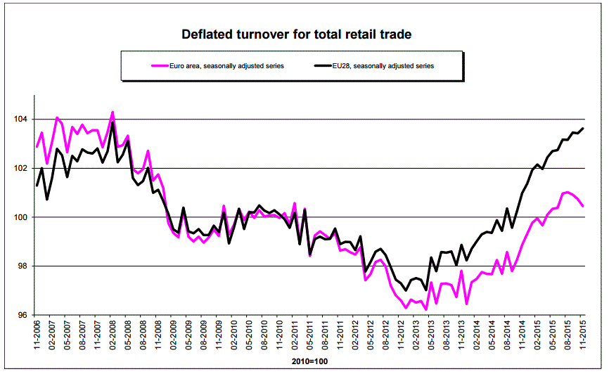 Кроме того, в Евростат сообщили, что по итогам ноября объем розничных продаж (с учетом сезонных колебаний) упал на 0,3% в еврозоне и вырос на 0,2% среди 28 стран ЕС. Напомним, в октябре было зафиксировано снижение продаж на 0,2% в еврозоне и нулевое изменение в ЕС. Ожидалось, что продажи в еврозоне увеличатся на 0,2%. В годовом выражении индекс розничных продаж вырос на 1,4% в еврозоне и на 2,6% в ЕС. Прогнозировалось, что продажи в еврозоне вырастут на 2,0% после повышения на 2,4% в октябре (пересмотрено с +2,5%).