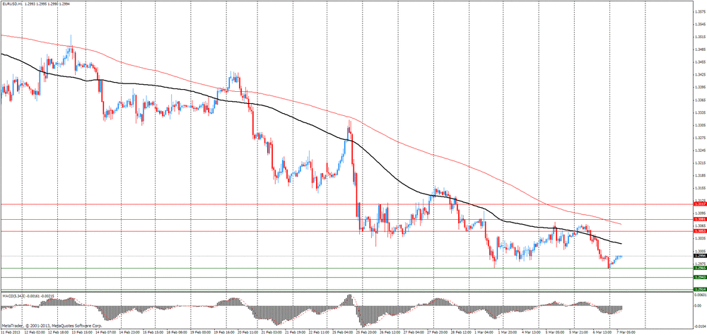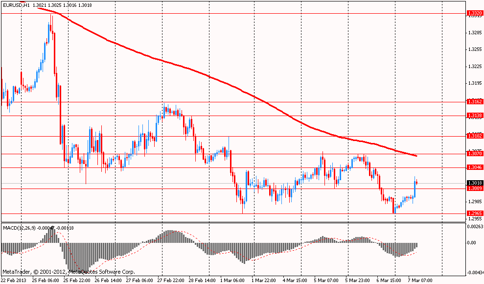 ЕЦБ, как многие и ожидали, оставил официальные процентные ставки без изменения восьмой месяц подряд, а Драги во вступительном слове не объявил ни о каких новых мерах стимулирования, несмотря на то, что данные этой недели показали, что экономика еврозоны в конце 2012 года сократилась пятый квартал подряд. Драги указал на то, что решение оставить ставки без изменения было принято "преобладающим консенсусом", нежели единогласно.