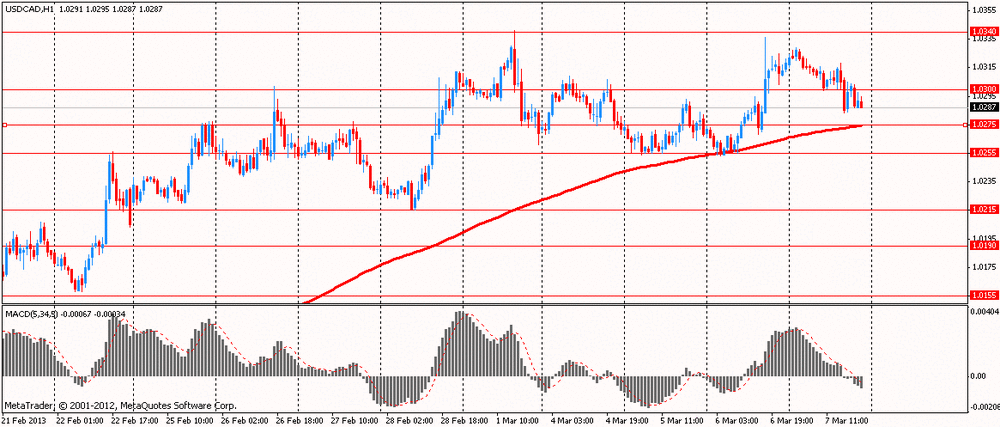 Поддержка находится на C$1.0275 (МА(200) для Н1), C$1.0255 (минимум 6 марта) и C$1.0215 (минимум 28 февраля). Сопротивление отмечено на C$1.0340 (максимум 1 марта) и C$1.0360 (максимум 28 июня 2012).