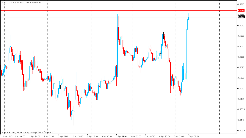 Австралийский доллар вырос после публикации данных, свидетельствовавших о более сильном, чем ожидалось, росте розничных продаж в Австралии. В феврале объем розничных продаж в Австралии увеличились на +0.7%, что выше ожиданий экономистов +0.4%. Предыдущее значение было пересмотрено с +0.4% на +0.5%. Однако рост австралийской валюты ограничен, так как среди инвесторов преобладает осторожность перед публикацией решения Резервного банка Австралии по процентной ставке в 04.30GMT.