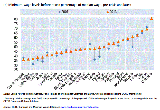 В ОЭСР отметили, что уровни минимальной заработной платы по сравнению со средней заработной платой сильно различаются в разных странах ОЭСР, начиная с 40% или ниже в Чешской Республике, Мексике, Соединенных Штатах, Японии и Эстонии и более чем на 60% в Словении, Франции, Чили и Турции. Это приводит к тому, что работники получают меньше, чем $3 за час в Мексике, Латвии, Чили и Эстонии, Венгрии и Чешской Республики и до $ 9 в Люксембурге и Австралии.