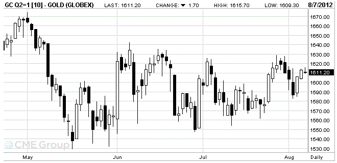 Стоимость августовского фьючерса на золото на COMEX сегодня выросла до 1615.7 доллара за унцию, затем упала и сейчас торгуется на отметке 1611.2 доллара за унцию.