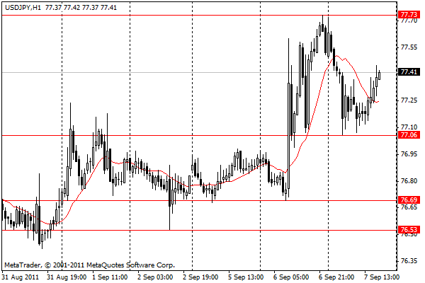 USD/JPY вырос с Y76.70 до Y77.60. После нескольких откатов курс обновил максимумы в районе Y77.72.