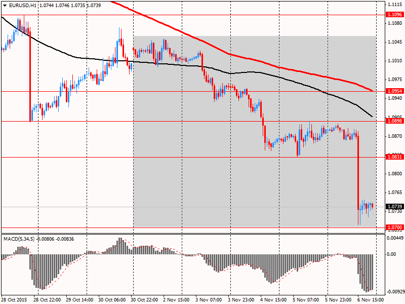 В пятницу евро обвалился против доллара, достигнув 6-месячного минимума, что было вызвано публикаций данных по рынку труда США, которые оказались значительно лучше прогнозов и увеличили вероятность скорого повышения ставки ФРС. Департамент труда США сообщил, что экономика США в октябре создала намного больше рабочих мест, чем ожидалось. Уровень занятости увеличился на 271 тыс. против прогноза в 180 тыс. Показатель за предыдущий период был пересмотрен до 137 тыс. от 142 тыс. Уровень безработицы снизился до 5,0% с 5,1%, а доля участия рабочей силы осталась на уровне 62,4% Средняя почасовая заработная плата рабочих частного сектора выросла в прошлом месяце на 9 центов до $ 25,20. По сравнению с годом ранее почасовая заработная плата выросла на 2,5%, по сравнению со средним темпом 2,0% в течение шести лет экспансии. Широкая мера безработицы, которая включает американцев, которые остаются занятыми на неполный рабочий день или ищут работу, упала до 9,8%, самого низкого уровня с мая 2008 года. Средняя продолжительность рабочей недели осталась на уровне 34,5 часов.