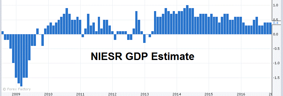 Согласно оценкам, опубликованным Национальным институтом экономических и социальных исследований (NIESR), в период с сентября по ноябрь рост ВВП Великобритании составил 0,4 процента, что совпало с изменением за предыдущий трехмесячный период (по октябрь).
