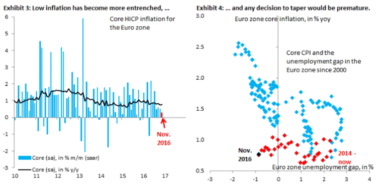 "Как известно, уже завтра состоится очередное заседание ЕЦБ. В связи с этим, участники рынка задаются такими вопросами. Во-первых, будет ли официальное решение по снижению объема программы количественного смягчения (QE). Во- вторых, если не будет официального объявления по этому вопросу (наш базовый сценарий предполагает продолжение программы покупки облигаций текущими темпами до конца 2017 года), является ли внешний фон для Совета управляющих достаточно губительным, что президент Драги на пресс-конференции по существу сигнализировал о скором сокращении объема QE. Мы считаем, что рынки будут относиться к любому результату с небольшим отличием. Скорее всего, пара EUR/USD продолжит свой восходящий тренд. Некоторые участники рынка обсуждали сценарии, при котором ЕЦБ разделит разницу, например, уменьшит ежемесячные покупки активов до 40-50 млрд. евро, а затем продлит программу, скажем, до 1-го квартала 2018 года. Мы считаем, что такие предложения не учитывают того, насколько скептическими становятся рынки, когда речь идет о ЕЦБ. В конце концов, декабрьская встреча ЕЦБ 2015 года и "осечка" в марте этого года приучили рынки крайне скептически относится к готовности и способности ЕЦБ смягчить политику. В результате, мы считаем, что рынки будут уделять больше внимание сигналам о сокращении объема QE, а не какому-либо расширению программы (которая подлежит изменению в любом случае). Мы считаем, что нет времени снижать покупки активов, просто из-за сложной динамики инфляции в еврозоне. Безусловно, преждевременное сокращение QE на декабрьском заседании только усложнит задачу ЕЦБ, а именно возвращение инфляции до целевого уровня", - заявили эксперты.