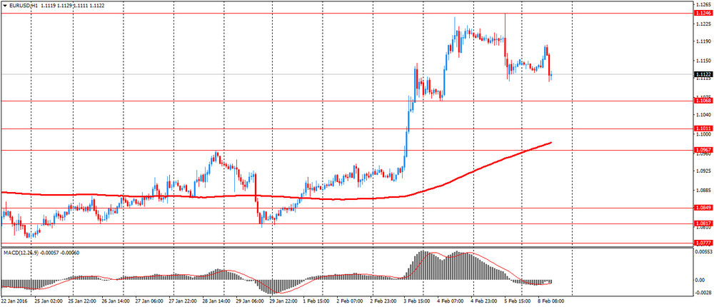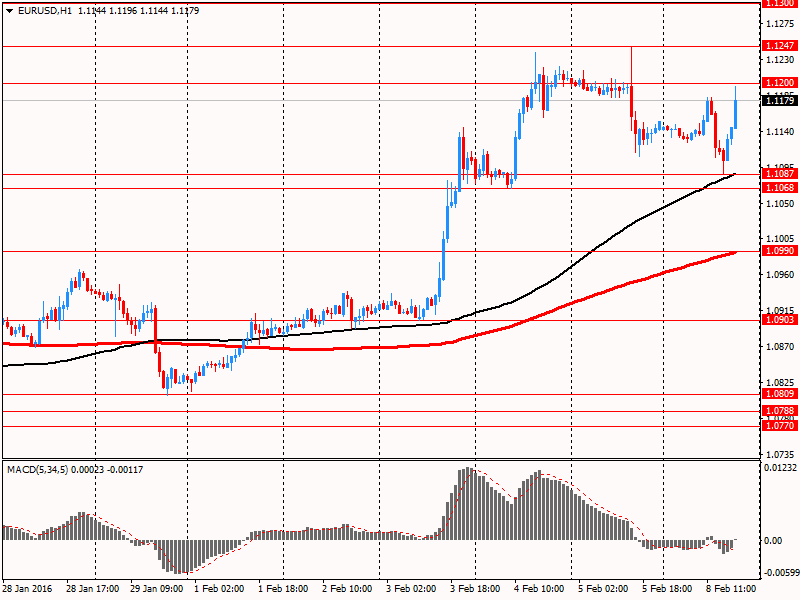 Евро заметно вырос против доллара, вернув при этом все ранее утраченные позиции. Аналитики отмечают, что падение фондовых рынков и нефти увеличило привлекательность евро в качестве валюты фондирования. Частично на ход торгов повлияли статистические данные. Результаты опроса от Sentix показали, что индикатор уверенности инвесторов упал до 6 в феврале с 9,6 в январе. По прогнозу индекс должен был снизиться до 7,2. Это был самый низкий показатель с апреля 2015 года. Индекс текущих условий опроса упал до 10,5 (самый низкий показатель с апреля 2015 года) против 13 пунктов в январе. В то же время, индекс ожиданий показал резкое падение до 1,5 с 6,3 месяца назад. Это был самый низкий показатель с ноября 2014 года. Уверенность инвесторов в Германии достигла своего самого слабого уровня с ноября 2014 года, индекс настроений инвесторов упал до 14,5 в феврале с 18,1 в январе. Индекс ожиданий упал до -2,6 в феврале с 1,8 в январе и индекс текущей ситуации снизился до 33 с 35,6 в январе.