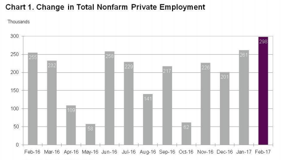 Данные от Automatic Data Processing (ADP) показали, что темпы роста занятости в частном секторе США ускорились в феврале сильнее, чем ожидалось. Согласно отчету, в феврале количество занятых выросло на 298 тыс. человек по сравнению с пересмотренным в сторону повышения показателем за январь на уровне 261 тыс. (первоначально сообщалось о росте на 246 тыс.). Аналитики ожидали, что число занятых увеличится на 190 тыс.