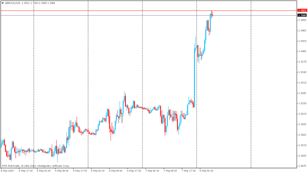 Фунт вырос по отношению к основным валютам после оглашения результатов голосования на выборах в парламент Великобритании. По данным экзит-пола, лидирует партия консерваторов, которую возглавляет премьер-министр Дэвид Кэмерон. Так, консерваторы могут получить 316 мест в парламенте. Лейбористская партия, получает 239 парламентских мест в 650-местном парламенте. Шотландская национальная партия может получить 58 мест в парламенте, а либеральные демократы - 10 мест.