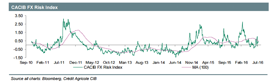"Сейчас наш индекс переместился на территорию риска - он составляет 0,45 пункта против 0,23 пункта 30 июня. Недавно мы подчеркнули, что осторожность остается оправданной. Забегая вперед, склонность к риску, вероятно, останется нестабильной. Прежде всего, возможности смягчения политики центральными банками, чтобы компенсировать более приглушенные перспективы роста мировой экономики, кажутся ограниченными. Следовательно, любое подтверждение дальнейшего ослабления импульса глобального роста должны напрямую повлиять на аппетит инвесторов к рисковым активам. Среди валют G10 иена является наиболее привлекательным активом-убежищем. Если наши ожидания относительно поддержания текущей денежно-кредитной политики ЦБ Японии окажутся верными, ситуация вряд ли изменится. С этой точки зрения следует ожидать, что японская иена продолжить опережать по производительности швейцарский франк", - сообщили аналитики.