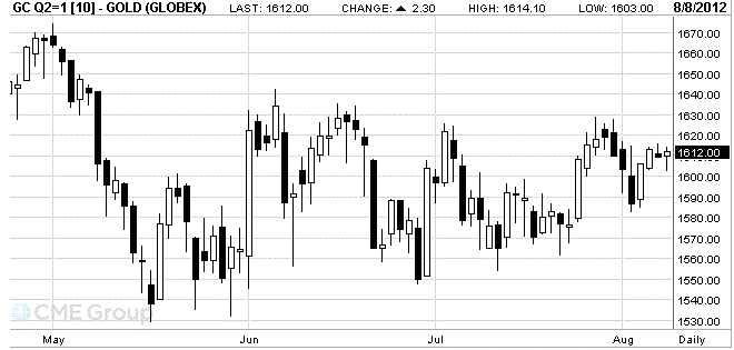 Стоимость августовского фьючерса на золото на COMEX сегодня снизилась до 1603 доллара за унцию, затем выросла и сейчас торгуется на отметке 1612 доллара за унцию.
