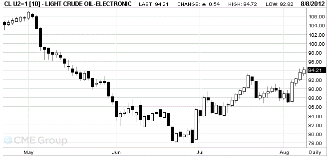 Стоимость сентябрьских фьючерсов на американскую легкую нефть марки WTI (Light Sweet Crude Oil) на NYMEX выросла до уровня $94,24 за баррель.