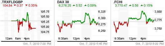 Европейские фондовые рынки закрылись с незначительными изменениями, поскольку неожиданное падение цен на недвижимость в Великобритании было компенсировано снижением количества первичных заявок на пособия по безработице в США. Акции Volvo AB потеряли 5,3% стоимости, а акции Renault SA укрепились на 8,5% после того как один из крупнейших автопроизводителей во Франции продал свою 14,9% долю в компании. Рыночная капитализация Kazakhmys Plc, крупнейшей в Казахстане медной компании, уменьшилась на 5,6%. Акции Man Group Plc, Actelion Ltd. и Demag Cranes AG взлетели на 5% после известия о возможном поглощении. Рынок консолидирует достижения после очень хорошей производительности," говорит Никола Тривелли, фондовый менеджер в Sella Gestioni Sgr. "Что касается сезона корпоративной отчетности, то ожидания аналитиков были пересмотрены с понижением, что уменьшает потенциальное влияние негативных сюрпризов." Alcoa Inc., крупнейший в США производитель алюминия, будет первой компанией которая опубликует свою отчетность в этом сезоне. Сегдня после закрытия американской сессии. Фондовый индекс Stoxx Europe 600 потерял менее 0,1%, достигнув отметки 262.31. В третьем квартале индекс укрепился на 6,7% на фоне роста оптимизма относительно корпоративных прибылей. В этом году индекс укрепился на 3,3%.