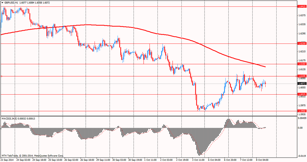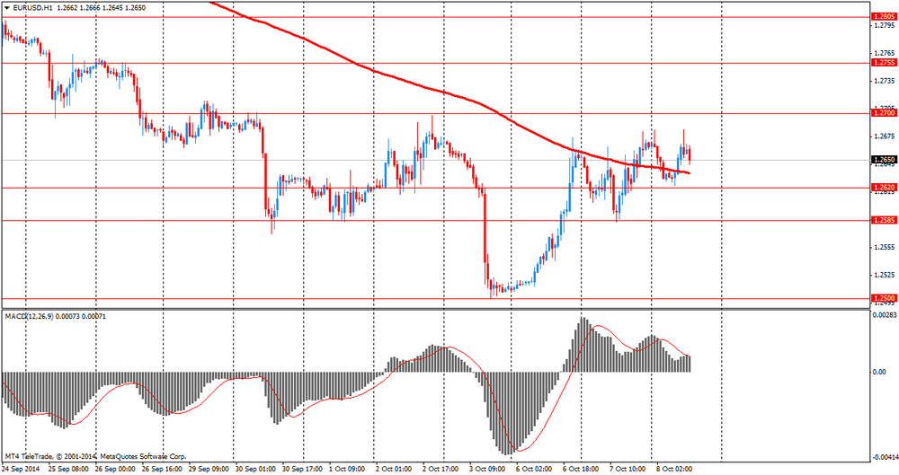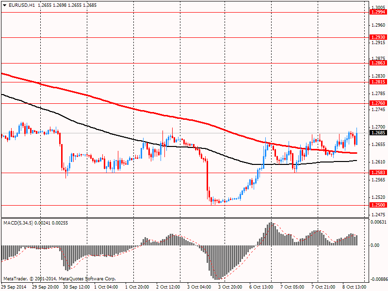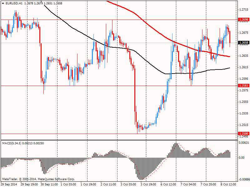 Евро отступил от сессионного максимума против доллара США, что связано с ожиданиями публикации протокола заседания FOMC. Участники рынка надеются получить намек на изменение ставки, однако последний отчет по занятости в США, вероятно, сделал итоги данного заседания устаревшими. Между тем, добавим, что на динамику торгов продолжает влиять вчерашние решение МВФ. Напомним, Международный валютный фонд снизил прогноз мирового роста как для этого, так для и следующего года и предупредил, что рост мировой экономики может уже не достичь докризисного уровня. МВФ прогнозирует мировой рост в 2014 году на 3,3% и рост на 3,8% в 2015 году, ниже на 0,1% в 2014 и на 0,2% в 2015 году по сравнению с прогнозом, сделанным в июле. Также отметим, что представленные на этом неделе данные по Германии усилили опасения, что крупнейшая экономика еврозоны впадает в рецессию. Это может вынудить Европейский ЦБ принять дополнительные стимулирующие меры, чтобы повысить замедляющиеся темпы роста экономики и инфляции в регионе. МВФ заявил, что Европа переживает «разноскоростное восстановление» и пересмотрел в сторону понижения свои прогнозы экономического роста для Германии, Франции и Италии, заявив, что прогресс во многих странах «медленный и предварительный».