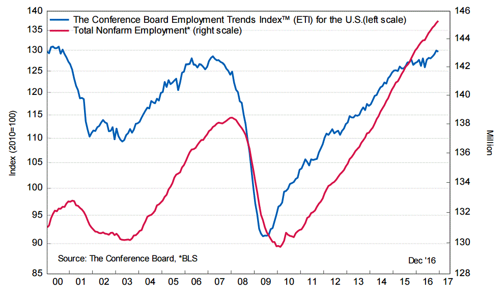 Согласно данным, ноябрьский индекс тенденций занятости ухудшился до 129,62 пункта по сравнению с 129,93 пункта в ноябре (пересмотрено с 129,96 пункта). В годовом выражении индекс вырос на 2,2 процента. Напомним, индекс включает в себя 8 индикаторов состояния рынка труда. В частности, в число этих индикаторов входит число заявок на пособие по безработице и число объявлений о приеме на работу, о которых сообщает Бюро статистики труда США, а также показатели промпроизводства, рассчитываемые ФРС. Индекс призван отсеять искажающие факторы и волатильность месячных показателей рынка труда, чтобы более четко продемонстрировать тенденции. В Conference Board сообщили, что в декабре 5 из 8 компонентов зафиксировали снижение.