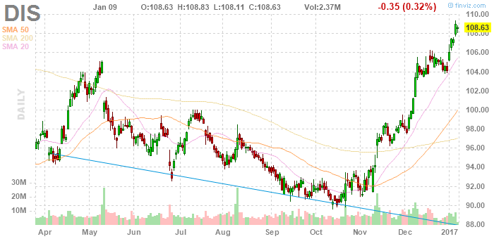 На текущий момент акции The Walt Disney Company (DIS) котируются по $108,63 (-0,32%)