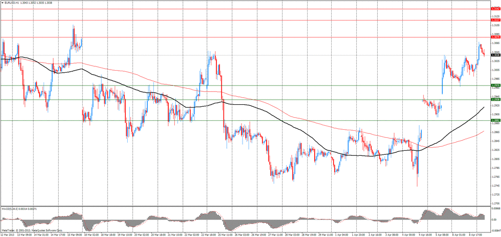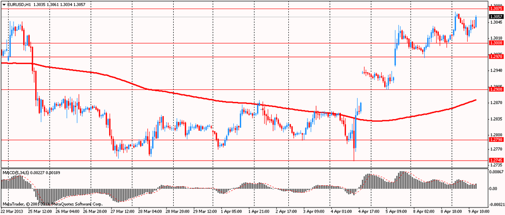 Австралийская валюта растет второй день, так как денежно-кредитные стимулы в США и Японии повысили спрос на высокодоходные активы. Также росту способствовали данные по инфляции в Китае, которые свидетельствовали о замедлении темпов роста индекса потребительских цен, что ослабило волнения по поводу возможного ужесточения монетарной политики правительством страны. Так, индекс потребительских цен в марте снизился на 0,9% м/м при прогнозах уменьшения лишь на 0,6% м/м и росте на 1,1% м/м, при этом по сравнению с прошлым годом показатель увеличился на 2,1%, хотя ожидалось более значительное повышение на 2,4% г/г после роста на 3,2% г/г месяцем ранее.Агентство Moody’s объявило сегодня, что оно сохраняет негативный прогноз по рейтингу Испании Baa3, который только на одну ступень превышает «бросовый» уровень, заявив, что правительство теряет доверие, не достигая бюджетных целей и неоднократно пересматривая показатели. Одна из основных причин - убежденность агенства в том, что страна не сможет сократить дефицит до целевого уровня ЕС. Заметим, что Испания сократила дефицит до 7% ВВП в прошлом году, промахнувшись мимо цели в 6,3%. Маловероятно, что страна достигнет и цели, установленной на текущий год, — 4,5% ВВП, отметило агентство.. По мнению Moody’s, Испания в этом году сможет сократить дефицит лишь до 6%, что, следовательно, не допустит замедления быстрого повышения бремени государственного долга.