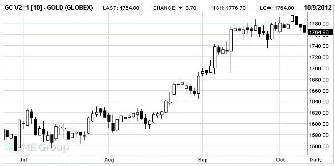 Стоимость октябрьского фьючерса на золото на COMEX упала сегодня на 8.7$ и сейчас составляет 1764.8 доллара за унцию.