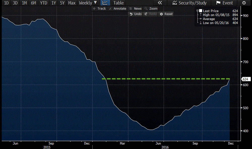 Отчет нефтесервисной компании Baker Hughes показал: с 3 по 9 декабря количество активных буровых установок по добыче нефти в США выросло до 498 единиц с 477 единиц. Последнее значение является самым высоким с конца января 2016 года. Количество установок по добыче газа увеличилось до 125 единиц с 119 единиц. Тем временем, общее число буровых установок (газовых и нефтяных) повысилось с 597 единиц до 624 единицы (максимум с конца января).