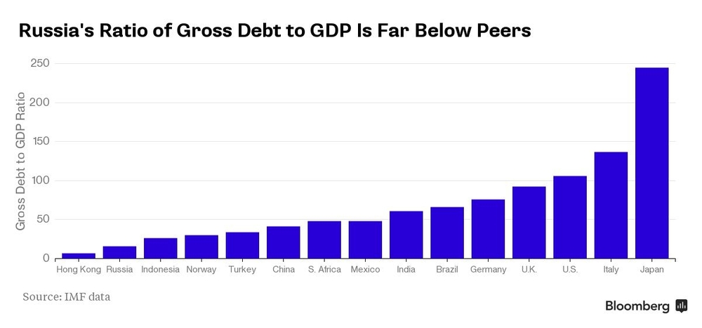2. Ограниченная задолженность и большой резервном фонде: Российский государственный долг составляет около 16% от ВВП, что является четвертым самым низким показателем среди 53 стран, отслеживаемых Международным валютным фондом. В то время как золотовалютные резервы сократились до восьмилетнего минимума и составляют 365 миллиардов долларов, они будут охватывать все предстоящие выплаты по государственным, корпоративным и банковским кредитам на ближайшие два года, согласно данным Банка России.